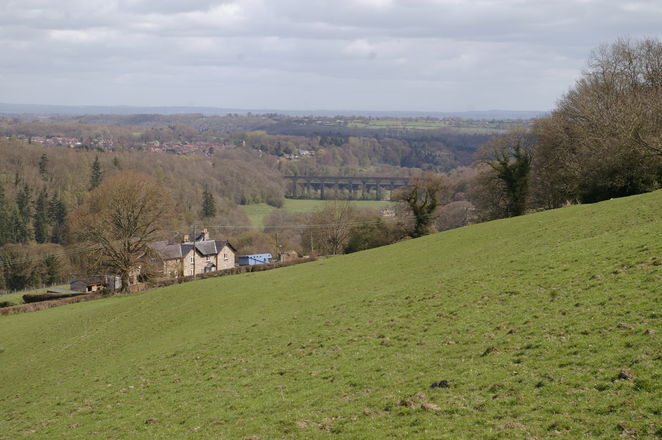 [3] At this point turn right leaving the Offas Dyke path (and Shropshire Way). Continue to the end of the green lane where it meets a tarmac lane on a bend (as you go along the lane look to the left for magnificent views of Chirk Castle). Keep straight ahead on the tarmac lane heading down hill, passing a farm on the right and a few cottages. Just after a sharp left hand bend and the cottages you will find a stile on the right. (Note that the path as marked on the OS Map does not align with the path on the ground here).