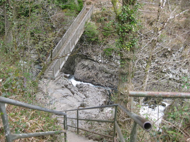 [5] Only 40 metres along this track there is a clearing below with views down to the river. On the opposite bank are some old ruined lead mine buildings (C). In another 50 metres take the track forking left downhill. At the bottom you cross a stream, go up again and where it forks turn left following the yellow footpath sign. Continue over a footbridge and the path turns into an uphill rocky section eventually meeting a track coming in from the right and a wire fence on the left. Go straight ahead and the delightful path now follows the fence with the river cascading down below you and cliffs above you on the right. After a few hundred metres a fenced path on the left leads to a bench at a spectacular viewing point. This is Swallow Falls (D) The Youth Hostel is hidden in the trees opposite