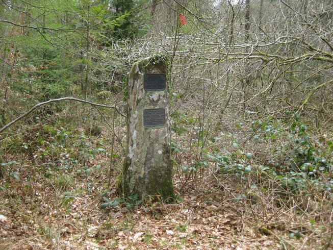 [2] Just before the track starts swinging right, take the narrow path crossing the ditch on the left hand side of the track up into the forest. This lovely path will be followed for over a kilometre winding through the trees above and away from the A5 below on the left. Initially the path goes uphill then passes above a compound below on the left. A little later on the path follows a wire fence around an old quarry before dropping down nearly to the road. An old wooden footbridge over a small stream is crossed here - beware of the rotten planks! About 100 metres after the bridge you will see a memorial stone to the right of the path (A) commemorating the planting of Gwydyr Forest starting in 1921. Continue following the winding path, still parallel with the road, until it passes a large white house on the left. The path, still fairly distinct, continues and eventually moves away from the road and reaches a forest track. Turn left and in 100 metres there is a small car parking space at the beginning of a narrow surfaced road which leads downhill between houses to the A5.