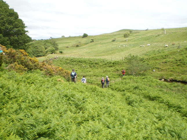 [6] Go past the farm and through a gate in a facing wall. Turn right and follow the wall and then fences on your right, crossing stiles until the path begins to descend into the valley of the Hisehope Burn. Cross a ladder stile over the wall on your right and continue downhill with the wall on your left to cross the burn over a footbridge.