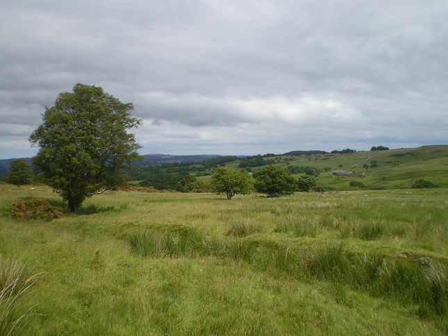 [5] Fork 30 deg. right along this footpath heading for the top of the nearby hill and soon crossing a track to an old quarry. (This section of footpath to Lamb Shields Farm is undefined and can be hard going through the heather. For the first section, the quarry access track provides an easier alternative route). Continue in a north easterley direction along the ridge of Harehope Hill. On passing the summit of this hill, continue in the same direction, heading for the trig point on the summit of Stoterley Hill. Bear right past this and go through a gate into a field and continue through two fields to Lamb Shields Farm.