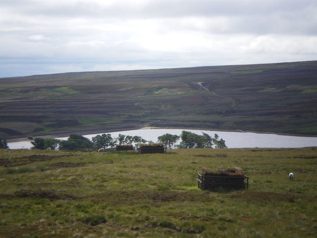 [7] Climb the facing slope with a fence on your left. Where the fence turns sharp left, follow a faint path parallel to the fence and then wall, until opposite a gate through it. Turn sharp right up the hill on a faint path heading for a structure on the skyline. Climb the hill and then steps up the embankment of Smiddy Shaw Reservoir.