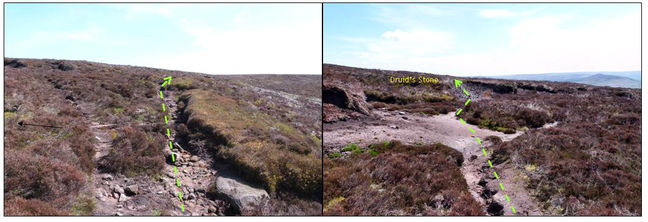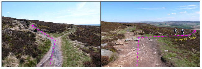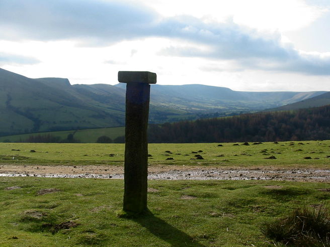 [3] By turning right off the promontory, continue on the south edge of the knoll for 3 minutes then at a stone (SK14343 88055) turn sharp left to descend back under the knoll. (you can cut the corner down a gully 150m before the stone). The path then swings right through a gateway towards a double tree. Here follow the sign left to descend to a wall where you go right over a stile on a rough bridleway. After 7 minutes arrive at Hope Cross after a gate.
