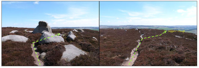 *In reduced visibility on Kinder, after the 2nd stile take the obvious lower path on the edge. After 5 mins bear up left on a peaty path, then in 12 more minutes bear right to cross Jaggers’ Clough and continue to the stone, passed on your left hand side joining the main route towards Hope Cross. This alternative saves 20 mins.