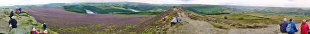 [4] Go on the track between the wall and the plantation fence which gradually slopes up to the summit of Win Hill, around 3km and nearly 1 hour away. After crossing a fence join the main track with a wall on the left. Eventually it leaves the plantation to skirt a knoll then bends to the left to arrive at Win Hill Pike at 462m, a good viewpoint with Ladybower Reservoir to the north, Shatton Moor to the south and Lose Hill (14m higher) to the west.