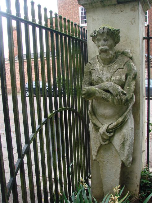 [6] Turn left to enter Belgrave Gardens. Follow this path around and exit the gardens through the gates facing Belgrave Hall notice the sculpted figures either side of the Belgrave Gardens gates (see photo). Turn left onto Church Lane.