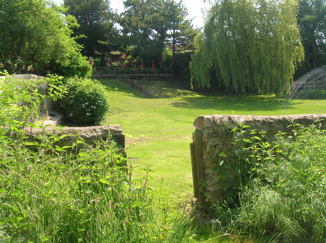 [3] Turn left. Keep to grass verge as road is busy and there is no path. At lay by, cross stile. Keep on path beside stream through metal kissing gate to cross bridge. Bear slightly right at bridge (moving away from stream) then keep ahead following signs to meet stream again (this time it is on your right). At footpath junction turn right on path to cross small bridge. Follow path until after stone steps then take footpath on right. Keep to right hand edge of field to reach and cross stile in field corner. Here you will see a gate in a wall which is the back way into the pub.