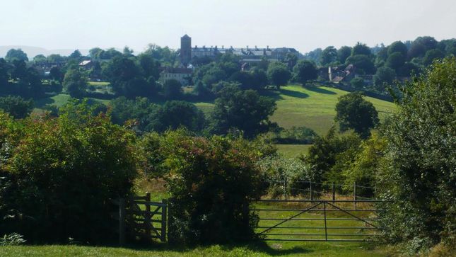 [1] At the corner of the car park to the left of where you drive in, go down steps to signalled crossing. Cross road and go left via forecourt of antique shop to follow footpath past main town car park, with office building on right (Smiths Gore). Just before public toilets, turn right along path between walls then ahead on minor road, passing library on left. At end of road turn right and continue, passing entrance to doctors' surgery then cross over road to follow signed footpath between allotments and past gardens.