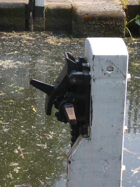 Lock paddle gear at (C) Boaters have a tool called a 'lock key' or 'windlass' with a square hole that engages with the pin and enables them to open the paddles to fill or empty the lock.