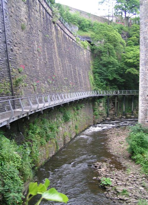 (B) The Millennium Walkway is a 175 yard long steel walkway part of which is attached to a massive retaining wall (built in 1860) supporting the railway.
