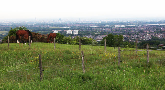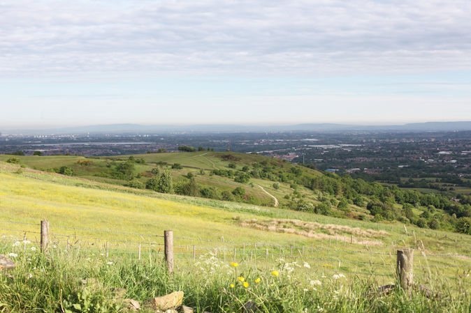 Matley Moor, with its pylons, is the summit that rises to the left of Mottram church. To the left is the Tame Valley that forms a boundary between a wild rural landscape and an urban landscape. The skyscraper on the summit above the urban sprawl is in Oldham town centre. Just to the left on the far skyline beyond the huge yellow and blue IKEA building in Ashton is the Scout Moor wind farm above Rochdale. Audenshaw Reservoirs are a very visible feature: to the left of these are the skyscrapers of Central Manchester, the highest and most prominent being Beetham Tower. Behind the reservoirs on the horizon more than twenty miles away is Winter Hill. Continuing westwards, the view changes from the Greater Manchester conurbation with distant moorland to the Lancashire and Cheshire Plain. Look beyond Stockport to see the planes taking off and landing at Manchester Airport.
