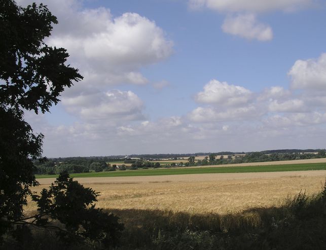 [1] Park in the village street at Pakenham and walk in the direction away from Bury St Edmunds passing the village hall and post office on the left to follow the road to a junction where one bears left but immediately takes the footpath on the right hand side and to the left of the grey-brick house facing you. You go up a grassy path rising gently to a kissing gate in the far corner of the field.