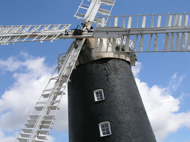 (B) Windmill. This is the second mill in Pakenham parish leading to the claim that there is no other parish in the country which has both a working watermill and a working windmill. This mill is thought to date from about 1820. She has a 5-storied brick tower, 4 sails and a fan tail. The sails drive 3 pairs of stones on the 2nd floor. The mill is open daily during working hours throughout the year. Before turning right at the cross-roads it is worth going straight ahead down Thieves Lane opposite for a short distance for a better view and perhaps a visit.