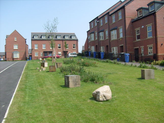 [1] Take the walkway almost opposite the main gate on Henson Street and cross the road into Clay Pit Way. This bends right and left to an interesting greenspace (A). If every wooden cube, post and boulder were seats, how many people could sit down? (30). Carry on down the hill and turn right into Tudor Close, which is red brick instead of tarmac. Follow it left to reach the main road along a short tarmac walkway.