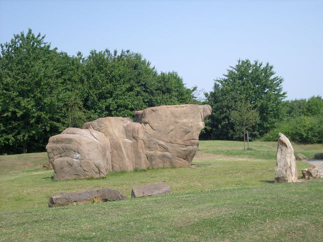 Look closely at the huge rock (B). Does it look real? Though the same colour as the smaller natural boulders around it this rock is made of concrete. Several Sheffield parks have them, some with hand and foot holds for climbing. Go straight on up the hill to a mosaic of four children (C). What are they doing and what organ inside their bodies is visible? You can see their hearts pumping and they appear to be doing hard exercise, keeping fit like you are on your walks.