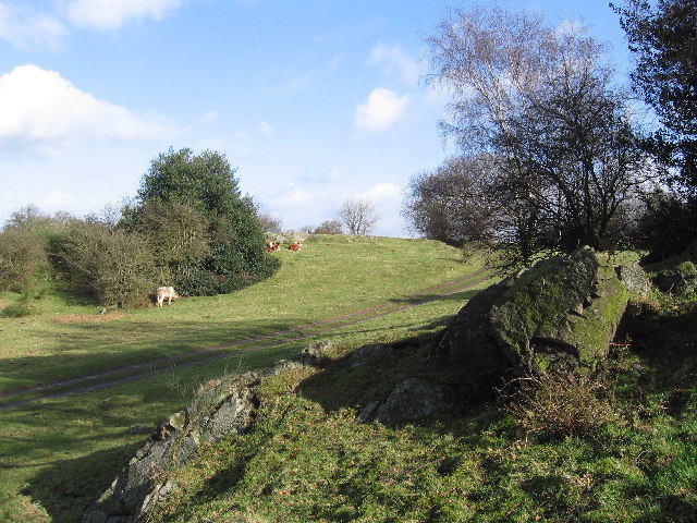 [6] Fork left across two fields to reach a wood. Go into the trees by a waymark and reach a track by a sharp right bend. Follow the track uphill to a gate. A rocky area just to the left makes a nice sandwich stop. Continue along the track to a road and take the path opposite down through a field to reach Newton Linford.