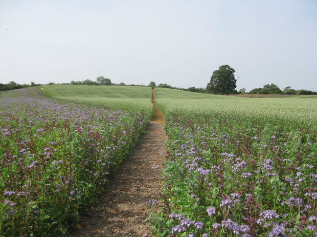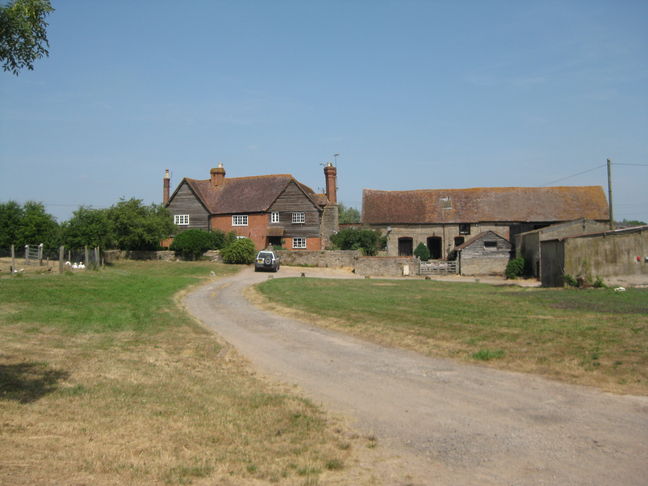 [2] Over footbridge continue with field hedge (and ditch) on your right to a gate into a wooded area to your front and another footbridge on your right over ditch. Do not go through gate but cross footbridge on your right and bear left to field gate. In next field bear right to gap in hedge (not to gap uphill to your front) and then bear left uphill to farm buildings. At farm yard turn right along track with farm house on your left and continue forward to brow of hill. Continue forward, slightly right, steeply downhill to pass small pond (possibly dry in summer) on your left – there is a much larger pond to your right a little further away - to a stile hidden in the hedge. Over stile continue forward to a farm gate and in next field bear diagonally left to a stile at the brow of the hill where the fence becomes a hedge. Over stile follow farm track with hedge on your left to corner and stile. Over stile turn left through farm gate and then follow fence on your right to stile onto road, A438.