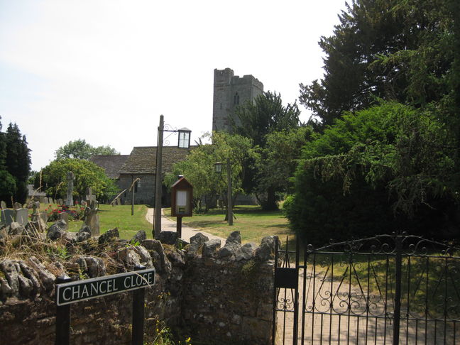 [4] Turn right along road and almost immediately turn right up farm access road to Underhill Farm. Before reaching the farm house itself follow track round to the left and where track splits follow left hand track uphill with hedge on your left to the edge on the wood. Continue on track round left hand corner as it gets steeper and when it flattens out at tree plantation follow track to your right through young trees. At junction turn right and then bear left (there are many tracks in this area) to keep the mature wood on your left and the younger new trees on your right. Follow green track round significant left hand bend to keep wood on your left and younger trees on your right until eventually the green track takes a hard right hand bend and there is a narrow path directly to your front into the wood, Follow this narrow path steeply downhill through the wood to reach a field. Cross stile on your left, just inside field, and bear diagonally right to right hand of two farm gates a little apart in far hedge. Through gate turn right and follow hedge on your right to stile. In next field continue forward across rough ground to cultivated field and then forward across field to far right hand corner and stile onto road. Turn right along road and where road bends left continue forward with small green and seat round tree on your left to go along Chancels Close. Go past Berrow Church (St Faith) on your right and soon turn left down short path and over footbridge. Continue forward through farm gate and field to another farm gate onto a minor road. Turn left and at T junction turn right and follow this minor road to your car.