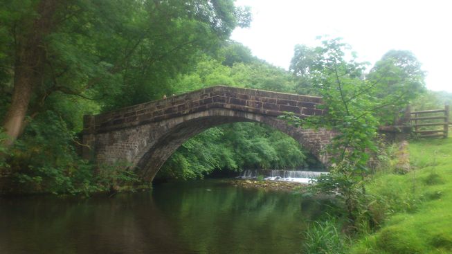 The hump backed bridge was built in the 18th Century. It is a grade II listed structure. It carried the main road into the area until the 1820s when a new bridge was built to serve the new village a little further downstream.