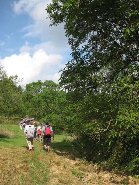 [1] With your back to the New Inn, turn left along road and in 5 yards left again at footpath sign. Follow hedge and ditch on left, over a cross track and continue in field with wood on left. Cross stile on your left buried in the hedge and follow the path through right hand edge of a walnut orchard to another wood. Follow right hand wood edge and after short distance bear left uphill through a wood on well used footpath. Go over stile by gate gate missing, through more walnut trees following Way Mark signs, then down into a dip bearing to the right to a stile below a white cottage. Follow permissive path, over 3 stiles anti clocwise, to go round the back of the cottage, then up a field and over stile at top. Continue forward up path between two fences to stile onto road.
