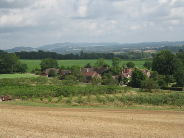 [4] Go up road and at T-junction (with cottage on your right), turn left. Almost immediately turn right through farm gate and follow bridleway across field, turning right in front of next gate. Continue along winding bridleway track, following hedge on left and eventually going through two metal gates to Ashcroft House with its hop kiln. Go along driveway and through another gate and on to road. Turn right along road. In a short distance (50 yards) bear left down cul-de-sac lane to Kingshill Cottages. Go through gate at end of lane, by cottages on your right, into an orchard, then straight ahead, ignoring footbridge and stile on your left, to follow a sunken small stream on your left. At end of orchard do not enter wood to your front but cross stream on your left and go through a pedestrian/bridleway gate. Climb bank and follow wood and hedge on your right to go through farm gate. The path continues uphill with initially wood on right to a small gate then on for another 150 yards to a small metal gate on the right, sometimes hidden in the hedge vegetation. Go through gate to admire a fine barn conversion, now an upmarket house, and turn left onto track and follow hedge on left.