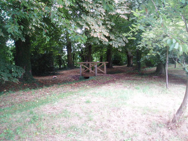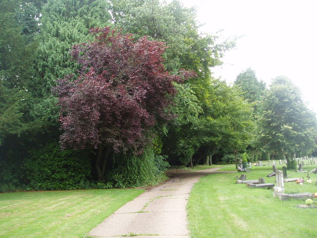 [4] Just after the first wooden bridge in the glade, on the left, take the path to the right and follow it all to the hedge in front. Turn left and then right to follow the hedge round the Gardens of Remembrance (Beware of traffic when crossing the road), with the Crematorium to the left. Continue ahead through the cemetery to the line of trees marking the road.