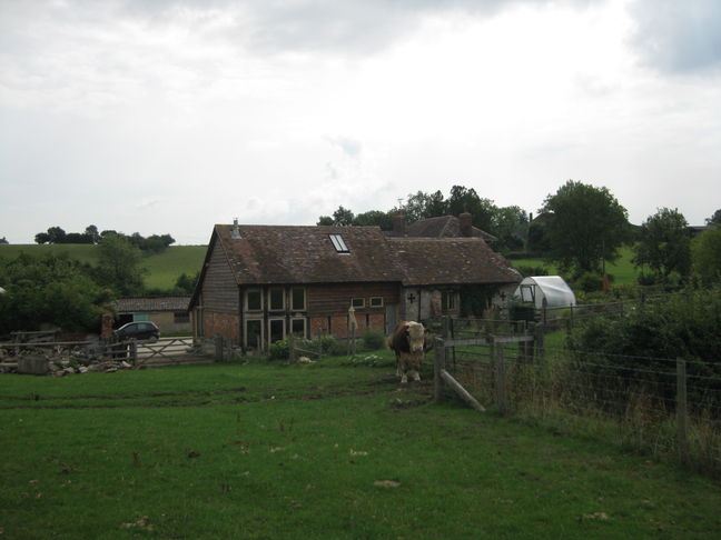[4]. On the minor road turn left and then up a driveway between cottages to your right. Follow the path through a gate and between a wood and fence, eventually going downhill, to a path on your right opposite a small gate. Turn right uphill on this path, go through a narrow wood and in a field follow the hedge on your right. After 200 yards turn left across the centre of the field to a farm gate to the left of a house in the far hedge. Turn right along the road and in about 300 yards turn left at a finger post and up a farm road. Where the road turns left at the top of small hill, turn right across the centre of the field towards a gate in the far hedge. In the next field follow the hedge and the edge of a small wood to go downhill towards another wood in the distance. When you reach the end of the field edge go through a small gap in the hedge in the lefthand hedge.Pass through the gap and bear diagonally right across a large field, keeping the single oak tree on your left and a clump of conifers on your right, to a farm gate in a protruding corner of the far hedge. Continue forward diagonally across a small orchard to a gate in the far hedge and, once through it, follow the hedge on your right round to the left and to farm buildings and an access track. Go down the track to reach a minor road and turn right. At road junction continue forward to your vehicle which should now be in sight.