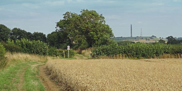 Go straight over a minor road and continue in the same direction, now with a hedge on your right. It is worth looking back the way you have come for a good view of the Charwelton communications towers. You can also see the hills behind Priors Hardwick to the south. Go through a gate in the far right field corner and continue down slope along the edge of a grassy field. Here you have another fine view, this time over the flat lands of Radbourne. This area was formed during the ice ages as sediment accumulated at the bottom of a lake of meltwater. In the distance you can see the cement factory chimney at Long Itchington. A gate in the bottom left corner brings you to a track junction. Turn right through another gate onto a footpath which you follow along the edge of three fields. A kissing gate gives access to a farm track. Walk straight ahead along the track. Turn right where the track joins a tarmac lane and then left at the junction with the Welsh Road. After 150 metres you will be back at waypoint 1. Take care along this final section as the Welsh Road sees fast moving motor traffic.