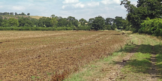 The long straight section comes to an end at a track junction, where your route turns left. 500 metres further on, with farm outbuildings on the left, you turn right onto a signposted bridleway which starts at a field gate. Walk up slope with a hedge on your right to reach a second gate. Continue straight ahead along a lane.