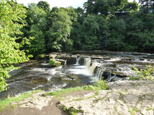 (C) Aysgarth Force is a triple flight of waterfalls surrounded by forest and farmland, carved out by the River Ure over an almost a one-mile stretch on its descent to mid-Wensleydale. The falls are quite spectacular during wet weather, as thousands of gallons of water cascade over the series of broad limestone steps consisting of horizontal layers of hard limestone separated by thin bands of soft shale. These rocks are part of the Yoredale geological series that were laid down on the sea floor over 300 million years ago, while the falls themselves are a product of the Ice Age.