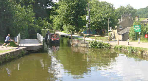 [9] Continue along the riverbank eventually passing the bottom of Nab Wood cemetery on your right, before going over a small footbridge and under the railway bridge to emerge into Hirst Wood. Here the path divides, our route follows the path steeply uphill to the right through the trees to join another path. Continue straight ahead through the woodland to the car parking area at the bottom of Hirst Lane. Turn left on the lane over Hirst Lock Swing Bridge and turn right onto the towpath to return to Saltaire.
