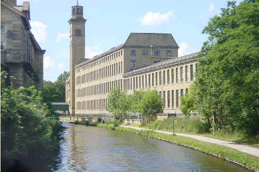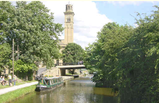 [1] At the end of Victoria Road close to (A) Sir Titus Salt's Mill, cross the bridges over the canal and river into (B) Roberts Park. Immediately, turn sharp left to walk alongside the river, bearing slightly right passing the Cricket Clubhouse. Just after the clubhouse go through the gate on your left onto a grassy area. Go forward, but when you come to a footbridge on your left, turn right up between houses to cross Glenwood Avenue. Then cross Higher Coach Road ahead, bearing slightly left up a bridleway to a woodland. At the junction turn left through the woodland on an easy wide path – at the fork turn left up Shipley Glen.