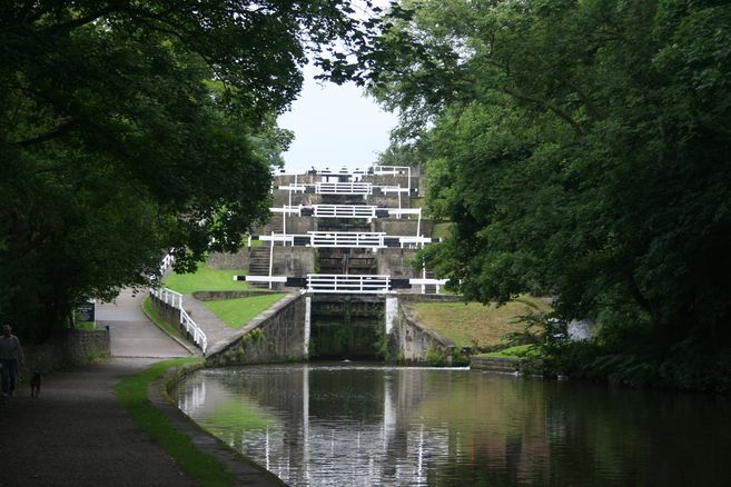 [6] Turn left at the roundabout and cross over the Leeds-Liverpool Canal – or call at the 5 Rise Lock Café. Turn left and walk back along the towpath passing the (C) 5 Rise Locks. Continue on past the 3 Rise Locks until you come to a metal suspension bridge in Bingley. Here turn right up a ramp, off the canal towpath and onto the suspension bridge. Walk across the bridge and across the slip road via a pelican crossing onto the opposite side. Turn left and go up Ferncliffe Road to the busy junction. Cross over Main Street (B6265), turn left and first right between the flats/houses in Myrtle Court. Walk straight ahead through the gateway and into Myrtle Park. Follow the narrow surfaced path as it bears left, passing a playground on the far right. At the junction continue ahead downhill on the now wider path (keeping the stone wall on your left). Before you reach the bottom, overlooking a large grassed area, turn left off the wide path onto a narrow, surfaced path which leads down to a footbridge over the River Aire.