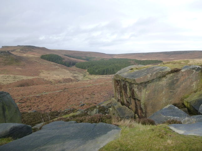 Looking along the Burbage Brook Valley towards Burbage Bridge (in the far distance) with Higger Tor on the left and Burbage Rocks on the right.
