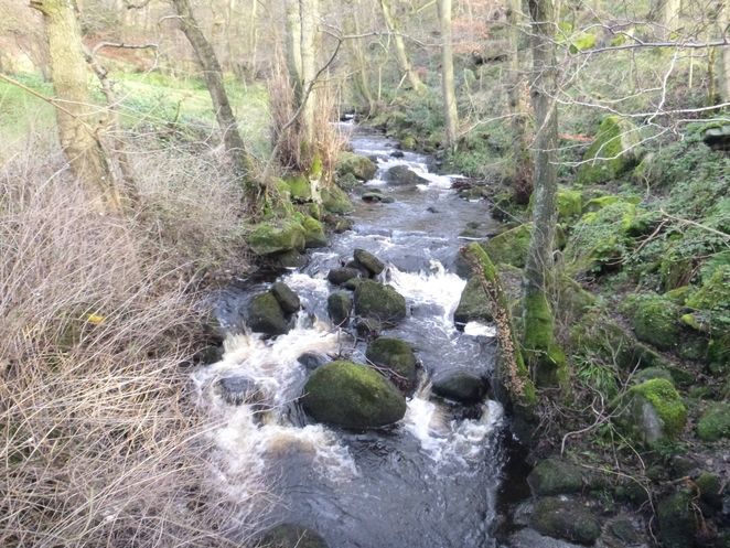 • Burbage Brook from the bridge in Padley Gorge near Grindleford Station. The path runs up through the trees to the right.