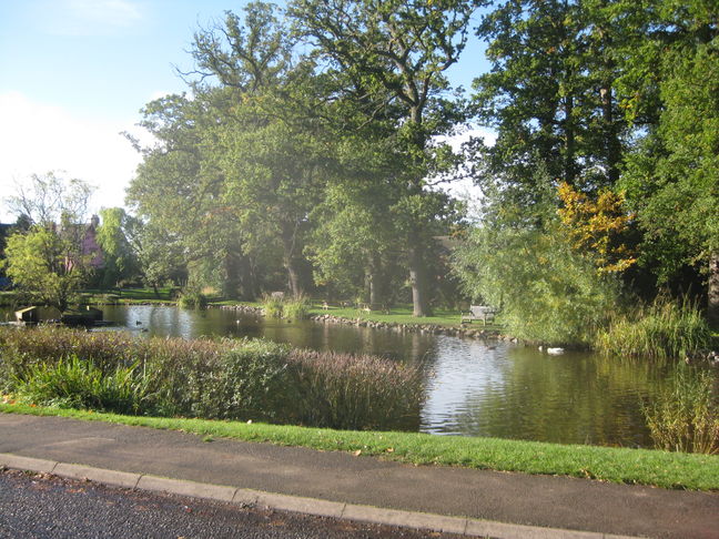 [3] Bear left across Wood Street, go through metal kissing gate, cross horse gallop and through a second kissing gate. Bredon Hill in distance ahead. Walk downhill (Ox Hill) beside wire fence on left to wide track. Go over small brook and through field gate and then uphill with hedge on your left to Stable Farm. Go over stile by gate onto farm drive. Note the Stable Farmhouse down driveway to your left with steeple and ornamental one handed clock. Proceed along tarmac farm drive, bearing left at junction to go over bridge and past Home Farm. Continue along tarmac lane to emerge on the Hanley Swan to Rhydd Road (812429). Swan Pool is on the right and a pleasant place for a picnic. The Swan Inn on the Village Green and the village shop across the road from the pond are good places for refreshments.