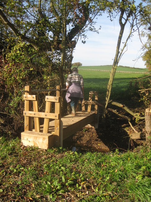 Turn right down driveway and soon go left through metal kissing gate and then diagonally right downhill across field to another kissing gate to the left of farm buildings. NB. This is a diversion approved in 2013 and may not yet be shown on your OS map. Continue forward across centre of field to footbridge in far hedge. Do NOT cross footbridge but go over the stile in the fence to the left of the footbridge and diagonally across next field, keeping left of a small pond, to the jutting out corner of far hedge. With this hedge on your left, in a few metres cross stile in hedge and then go diagonally across field to footbridge in hedge near farm barns. Cross and, with farm buildings on your left, cross field towards church tower in distance and go over footbridge and through a gate to enter church yard.