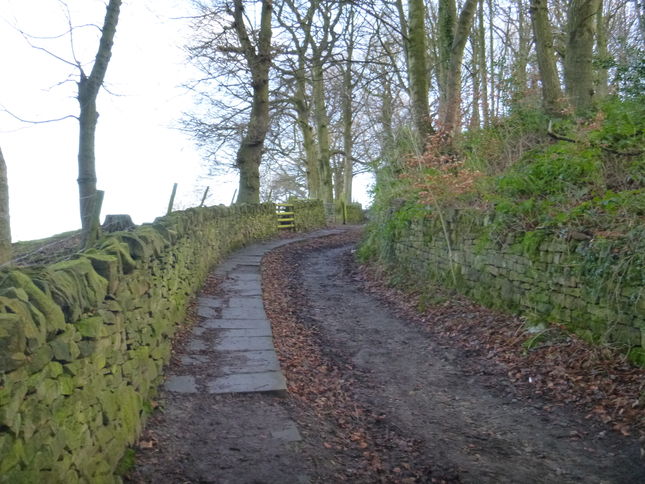 [2] Cross, turn left to footpath sign and go over stone stile on right to follow path right along hedge/fence to end of field to turn right between trees and fencing. At Cottage Lane cross and go ahead along Common Lane (track) through park to another road. Turn left, and go along road around right hand bend, but at next bend follow footpath right beside stone building to pick up an old paved track over a ford then uphill to houses (Trapp Lane). Go ahead to a junction, and follow fingerpost on left down steps to follow a path/track bearing right down into woodland.