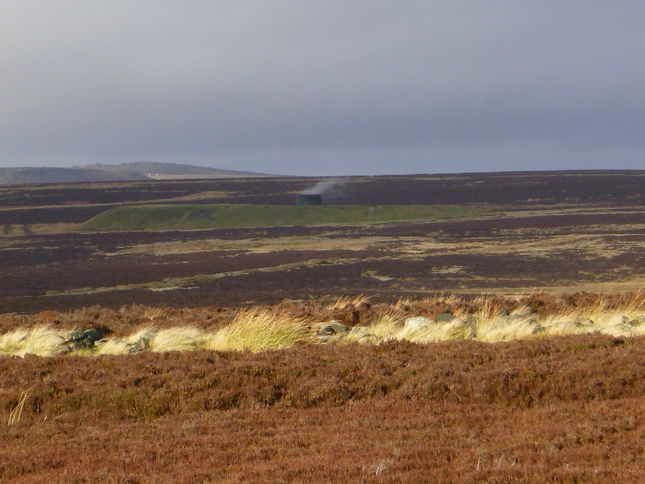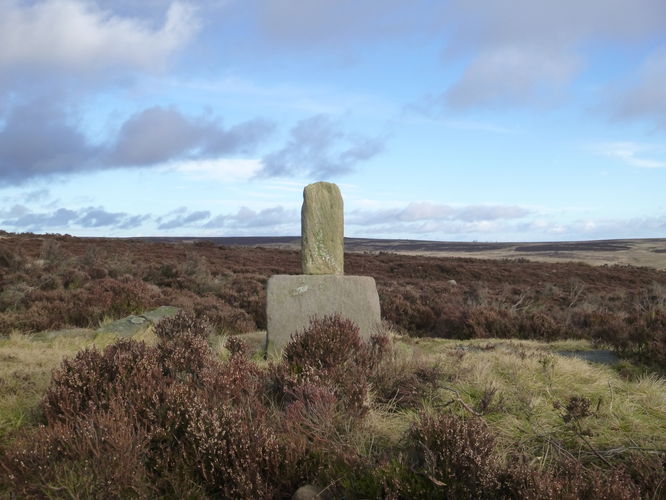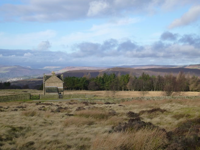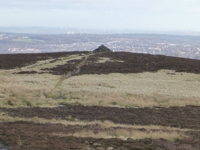 [2] Just before the Lodge take a path on the left by a wall and keep left uphill to a gate on the top of White Edge. Go through, turn left then immediately right continuing straight ahead over the moor. Look out for the stump of (B) Lady's Cross on your right. On reaching a road turn right along it. Soon you will see a gate on the opposite side of the road. Cross, go through it and follow the narrow path ahead through the heather across the moor. Take care as a section of this path can be boggy. As you cross the moor you will see the ventilation shafts (C) of Totley Tunnel. Eventually you reach the remains of a wall. Turn right and follow it ahead, passing a trig point to your left, across a track until you reach a large cairn.