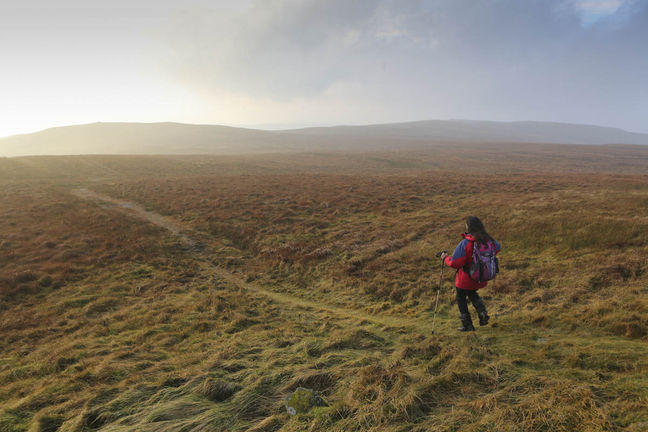 5. On the final bend to the right, close to a group of conifers and just before a cattle grid, take the muddy track to the left. Keep right at any forks through a series of small fields. You’ll see a slender waterfall in a cleft in the hillside ahead. Make directly for this. One final gate gives access to the open slopes near the waterfall. Step onto the track and follow it up towards a large green box. It then swings right to ford the burn.