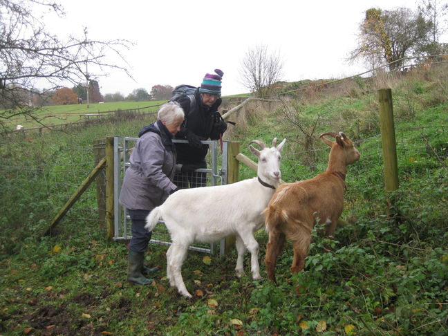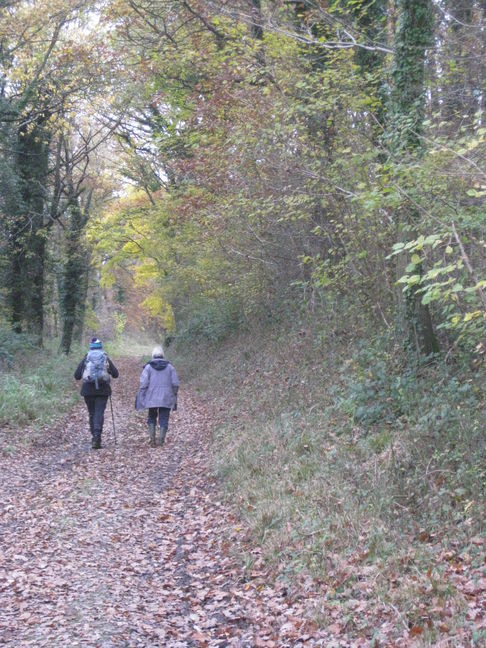 Follow track initially left but soon turn right along another track in orchard to pass a bench and to a kissing gate at the far end. Now follow hedge to your left to reach footbridge on your left, cross and go diagonally across small field to kissing gate by right hand corner of wood. In next field (orchard) follow path uphill with wood on your left and, at top, bear left down stone track that eventually curves right and through pedestrian gate to reach road. Turn left along the road and in a few metres cross to enter small car park on your right where your cars are parked.