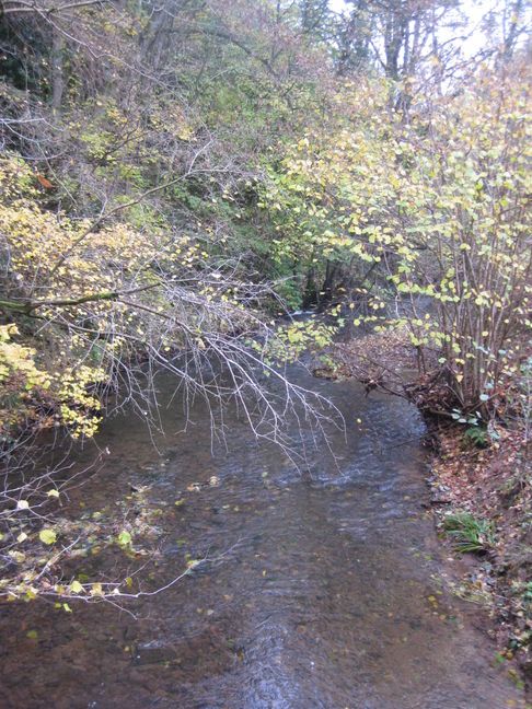 [3] Cross main road and turn left to go along road, slightly uphill, until you reach a road junction to your left. Just past this junction turn right along narrow alleyway to stile and continue forward to next stile and farm road. Turn left along this farm road and continue through a couple of farm gates and eventually a wood to reach a minor road at the end of the wood. Turn right and follow this minor road for 800m, going past Birchwood Lodge Farm on your right and a stile and footpath on your right, until the road bends left and a driveway continues forward in front of you. Do not go up driveway but turn right over a stile and then bear left to some large trees. Continue forward in next field to kissing gate in far right hand corner. Continue across centre of next field to kissing gate just to the right of the house. Continue forward in wood along track, generally going downhill, and about 300m after track bends to the right, turn left down a way marked path with the cottage garden on your right. At path T junction turn left and soon right to follow path to tarmac lane, Turn left and in about 100m turn right down another footpath (finger post) going steeply downhill.
