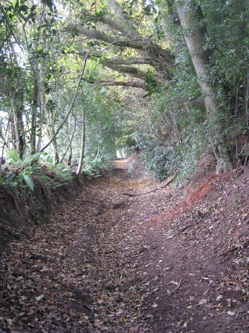 [2] Turn left along road and in 25 yards at farm track turn right to farm gate and kissing gate. Follow track for 400m as it curves left uphill. At top of hill continue forward, to the right as track starts to descend into orchard. Almost immediately take steps on your right into wooded area and follow path downhill, with orchard on your left, for 300m to reach kissing gate at end of orchard. Through kissing gate, bear left across small field to footbridge and then follow fence on your left for 200m. Where fence turns left, bear right uphill along a shallow gulley towards right hand end of wood.