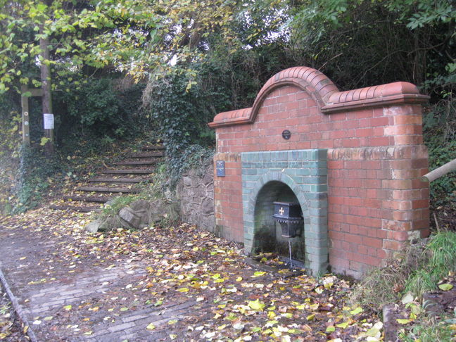 [1] From car park return to B4219 road and cross. Note the Malvern Water outlet (spout) – known as the Beauchamp Fountain – at the roadside.