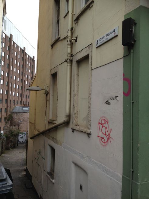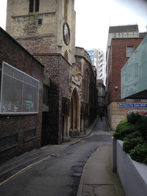 [1] Starting at St James Barton, with Debenhams behind you, facing 'The Bear Pit'. Go down into The Bear Pit (subway) - there is both step or slope access. Take the first exit on your left; under the Premier Inn. Turn left out of the subway. As you come out you should have Beafeater on your right. Continue to walk on the raised path immediately outside this restaurant. The path takes you down St. James' Parade where you'll have Bristol Bus station on your right and St. James' Park on your left. Continue to the end of this path and down the short flight of steps. Turn right on to Lower Maudlin Street. Head to the top of this road, passing the eye and dental hospitals on your left. Turn left onto Upper Maudlin Street. Continue until you see a tiny alleyway on your left (see photo) just after the education centre and before a cafe. The alley is called Johnny Ball Lane. You'll have just passed the BRI (hospital) and the children's hospital on your right.